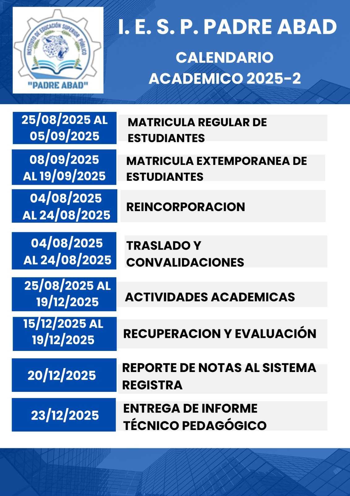 La institución educativa IESP Padre Abad anuncia con entusiasmo el inicio del Calendario Académico 2025-II, presentando el cronograma oficial de actividades que marca el desarrollo del ciclo. Nuestros docentes, con el compromiso que los caracteriza, expresan su motivación y disposición para continuar compartiendo sus conocimientos y experiencias con los estudiantes, fortaleciendo así su formación profesional y personal.